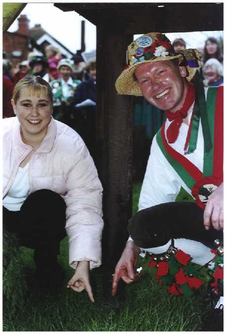 Sally and Chris point to the spot where the "wren" (a tea cosy)