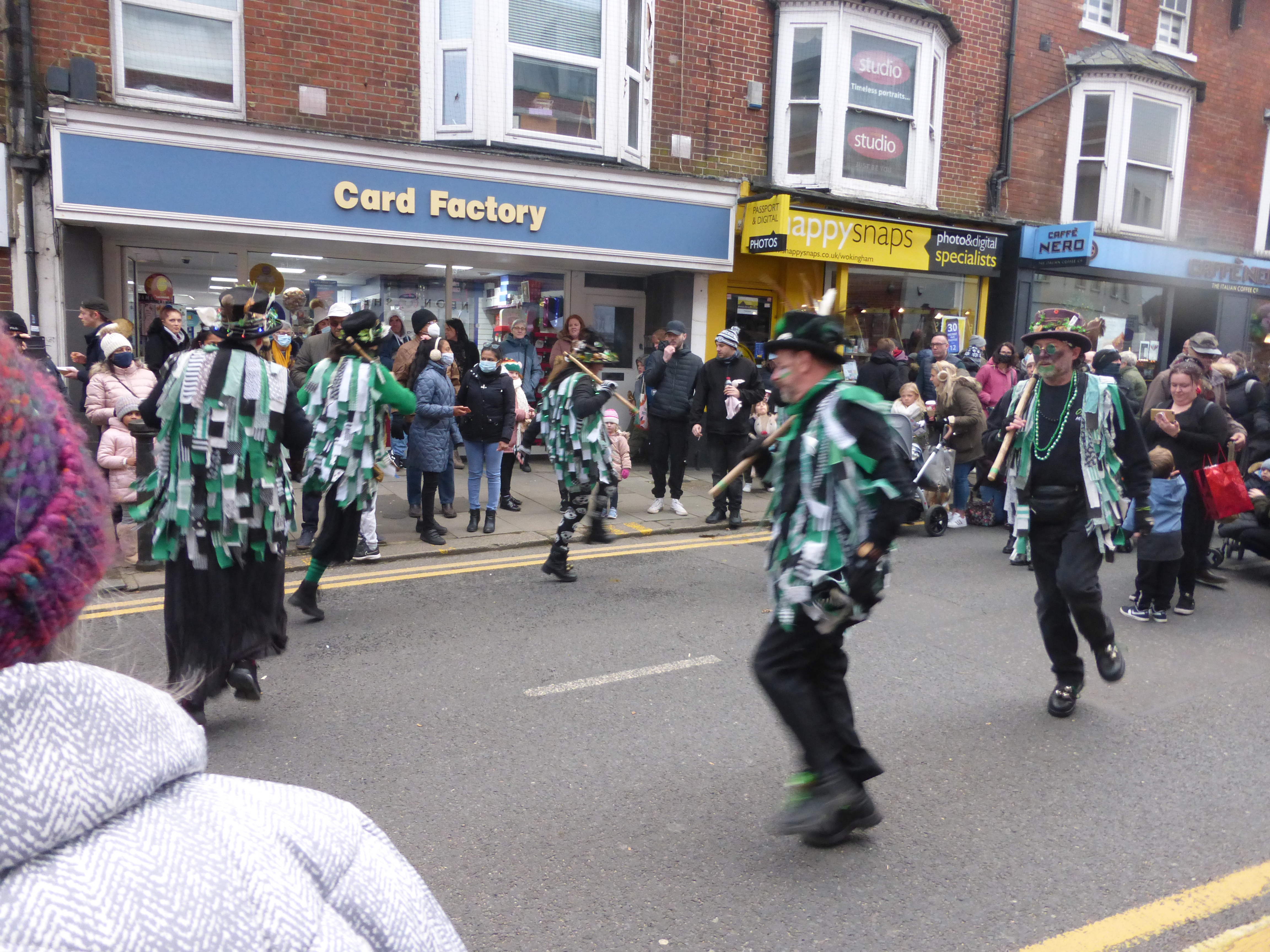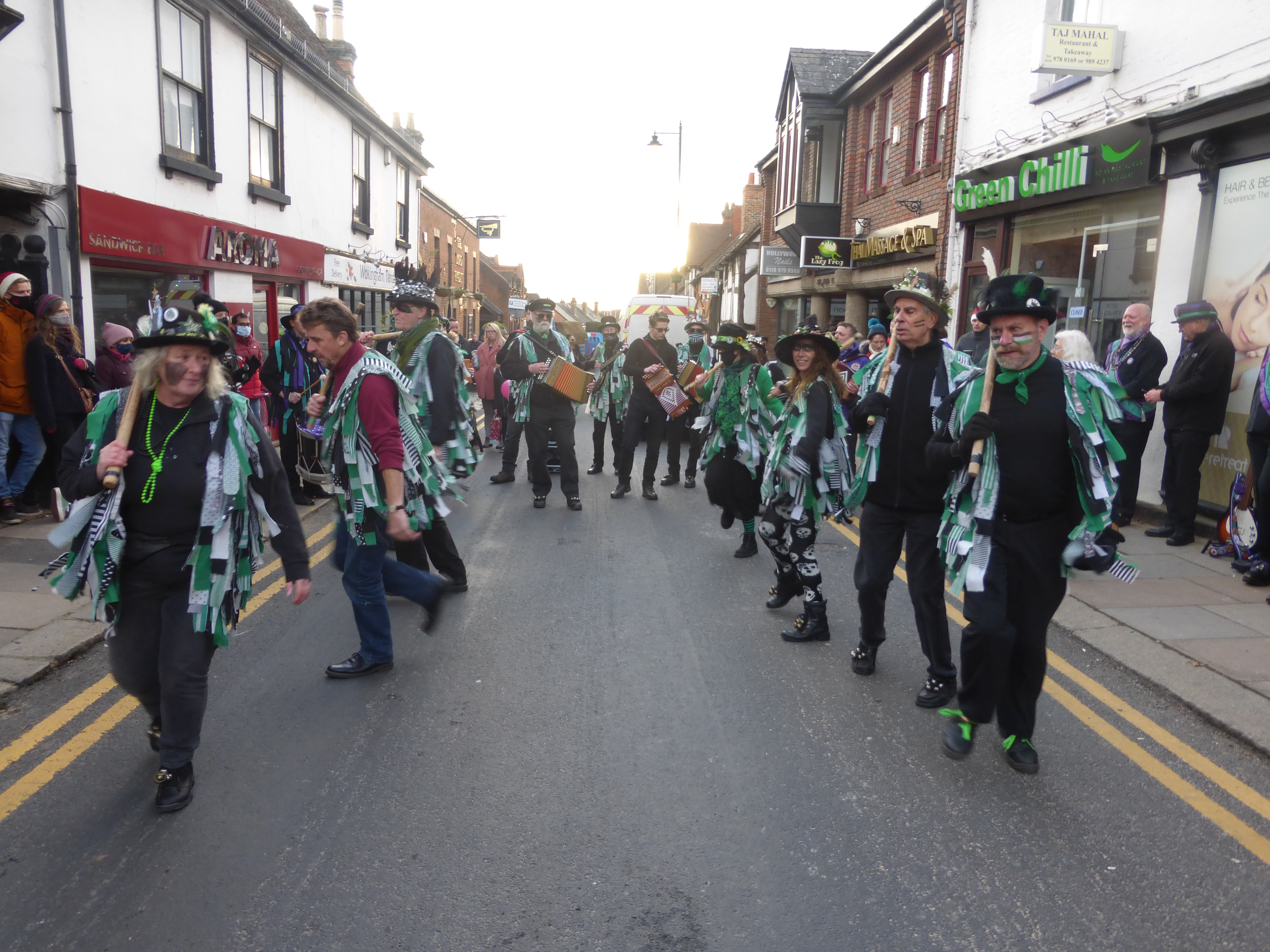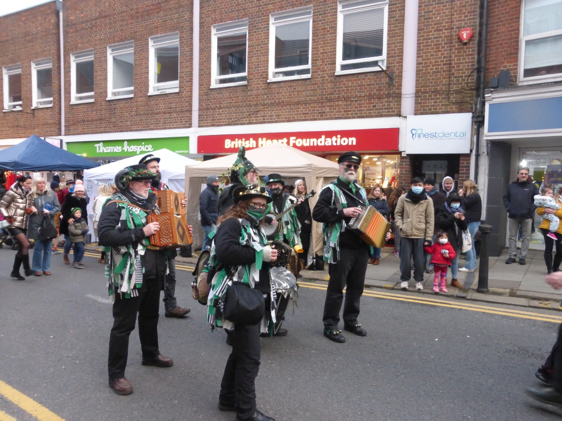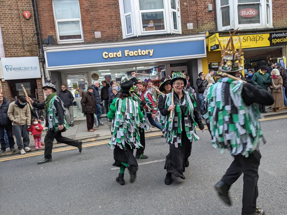 A somewhat scaled-down Wokingham Winter Carnival due to Covid. The morris was limited to four sides, sharing two dance spots, and there was no procession at the end of a long day (gutted!).