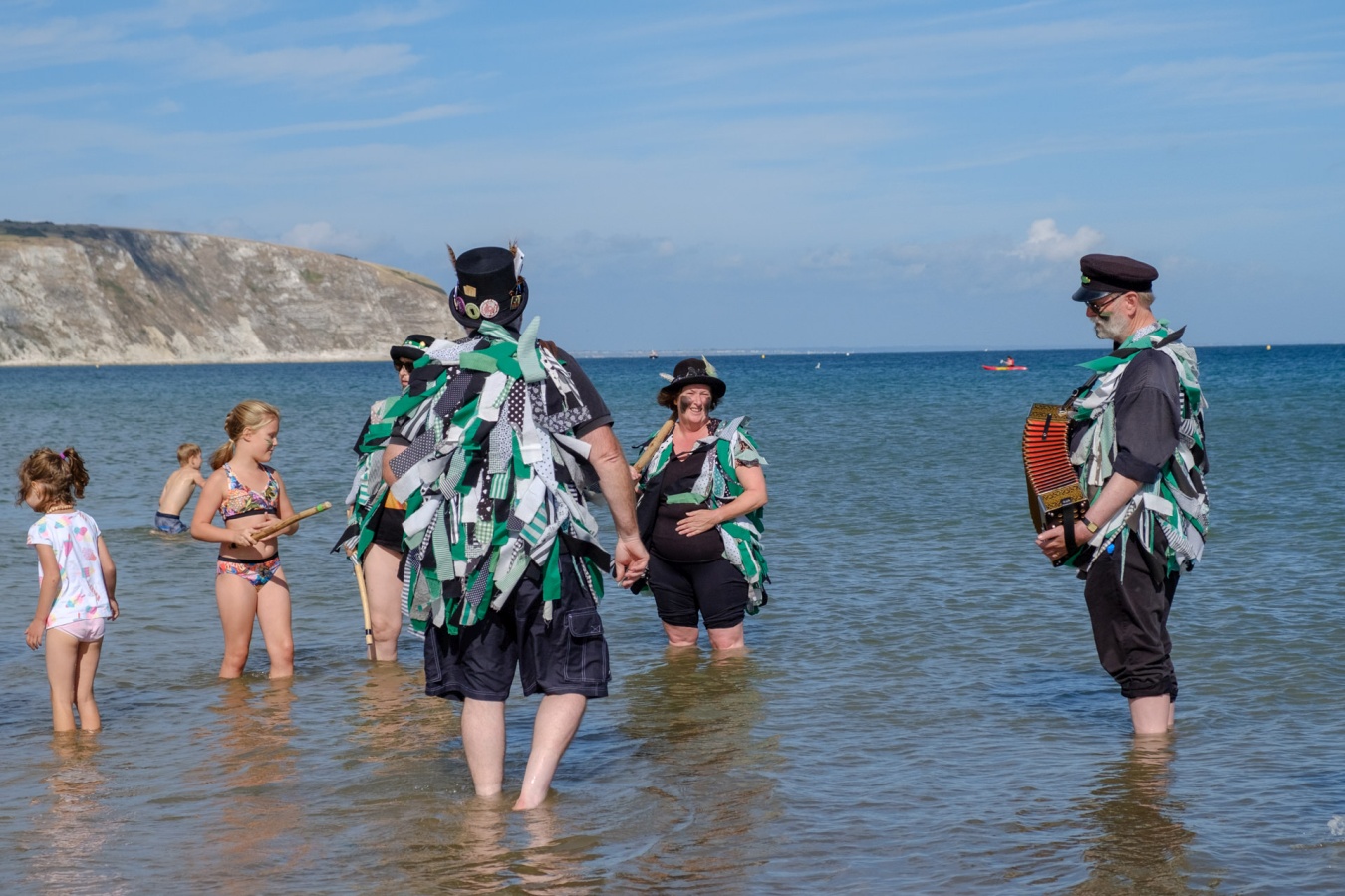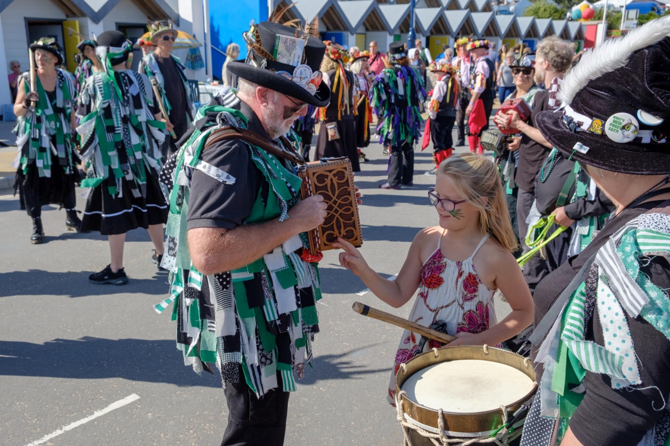 Sunday on the Sea FrontLater in the day, we were dancing somewhere along the sea front, and joined by Freya and various grandchildren, nieces etc All of them were little stars, especially the little dancing queen in the stripey dress. Freya, from our B&B, received a bit of instruction in melodeon-playing from Joe - we always stay at the brilliant Millbrook Bed & Breakfast |